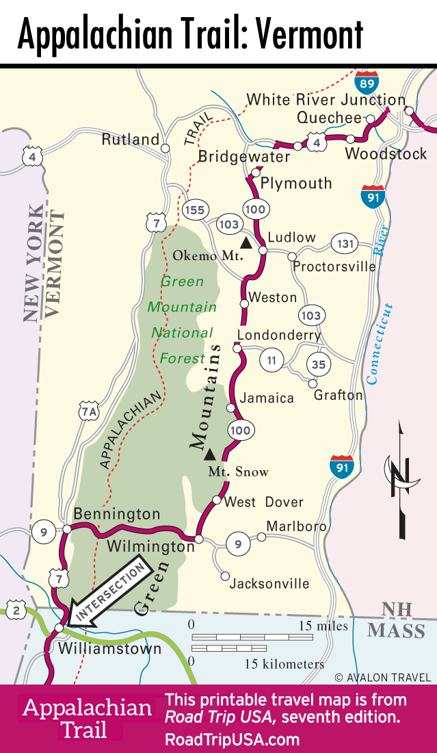 After an extended sojourn through the rugged and buggy wilds of northern Maine, where the hikers’ route winds to the top of Mt. Katahdin, our Appalachian Trail driving tour reaches an early high point atop windswept Mt. Washington in the heart of New Hampshire’s Presidential Range. From these 6,000-ft (1,800-m) peaks, the tallest mountains in New England and some of the hardest and most durable rocks on earth, the route winds through Vermont’s Green Mountains, taking in the idyllic charms of rural New England, with its summer homes and liberal-arts college communities. Beyond the Berkshires, the summer destination of the Boston and New York culture vultures and intelligentsia for most of two centuries, towns become even more prissy and pretty as we approach within commuting distance of New York City.