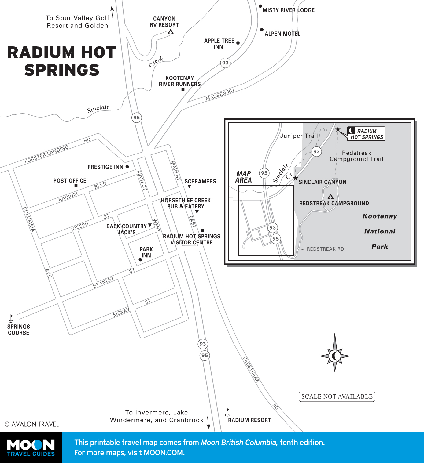 At the west edge of Kootenay National Park, the town of Radium Hot Springs is a swift change from the natural idyll. Motels, cafés, and gas stations line Hwy-93 block after block, and apart from satisfying your fuel-and-food needs, there’s not a lot here. The one good place to eat is Springs Elevation Restaurant west of town on the golf course at family-friendly Springs Course, (250/347-6200 or 800/667-6444, C$110 and up). Standard motels here include the Alpen Motel (250/347-9823, C$79-139).