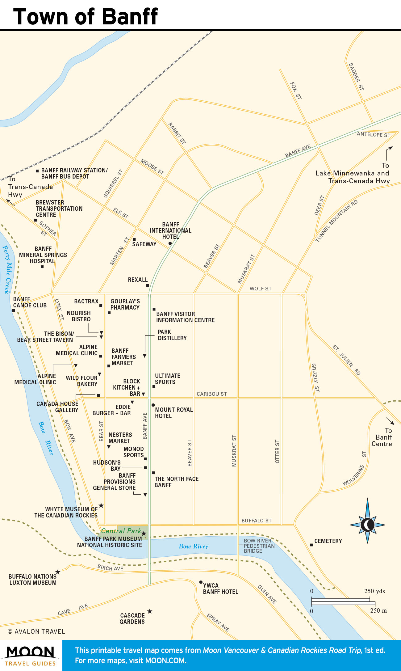 The town’s main drag, Banff Avenue, has all the cafés, restaurants, and shopping you could want. But if the weather’s bad (if it’s not, you ought to be outdoors, enjoying Mother Nature!), you can learn about Banff and the Canadian Rockies in the local museums. Best first stop is the Banff Park Museum (Wed.-Sun., C$4), near the river at the foot of Banff Avenue, a Victorian-era remnant (it was built in 1903) that displays the taxidermied remains of typical park wildlife. Around the corner, a half block down from pleasant riverside Central Park, the Whyte Museum of the Canadian Rockies (111 Bear St., daily, C$10) has an expansive collection of historic books, postcards, paintings, and photographs, all capturing various aspects of the mountains and their inhabitants.