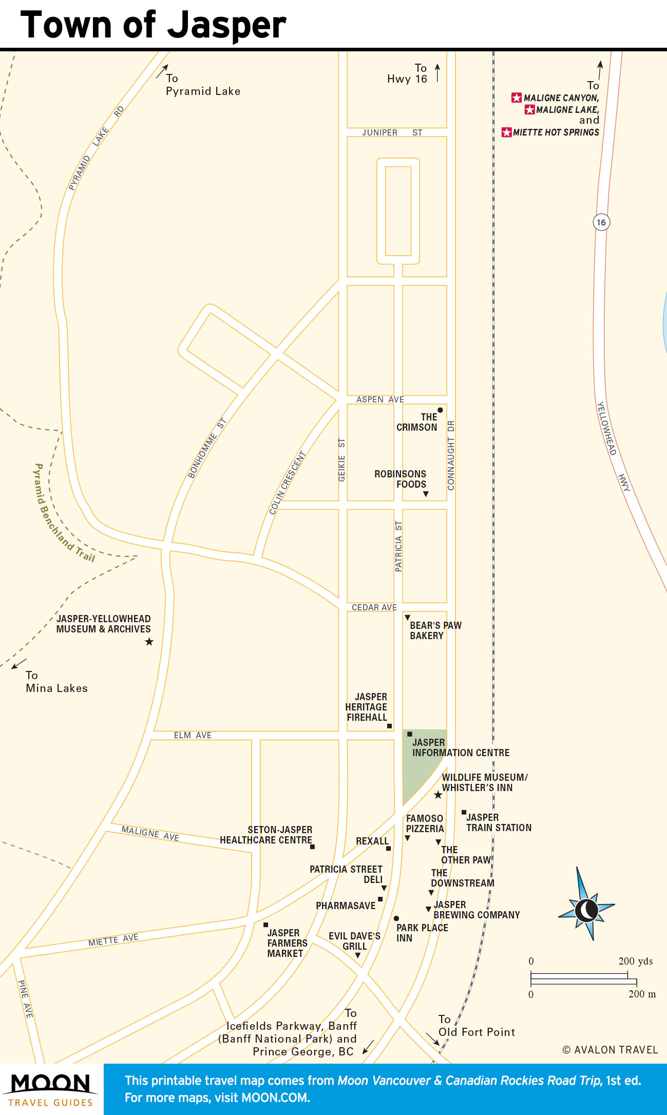 The northernmost point on Hwy-93, at the junction of the Icefields Parkway with the cross-country Yellowhead Highway (Hwy-16), which links Edmonton with Prince Rupert, the town of Jasper (pop. 4,590) preserves its frontier character intact. Unlike Banff, which exudes wealth and comfort, Jasper, which became an incorporated entity only in 2001 and is officially referred to as the “Town of Jasper” to differentiate it from Jasper National Park, is a rough-and-ready workaday sort of place. Founded on fur trading and mining, Jasper boomed when a cross-Canada railroad came through in 1911, but since the establishment of the national park in 1930, Jasper has served primarily as a handy base for exploring the wilds that surround it.