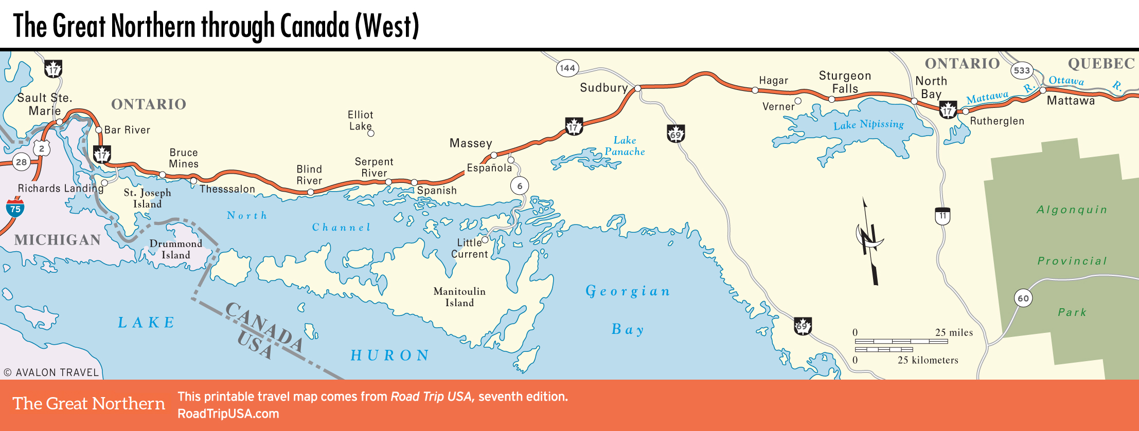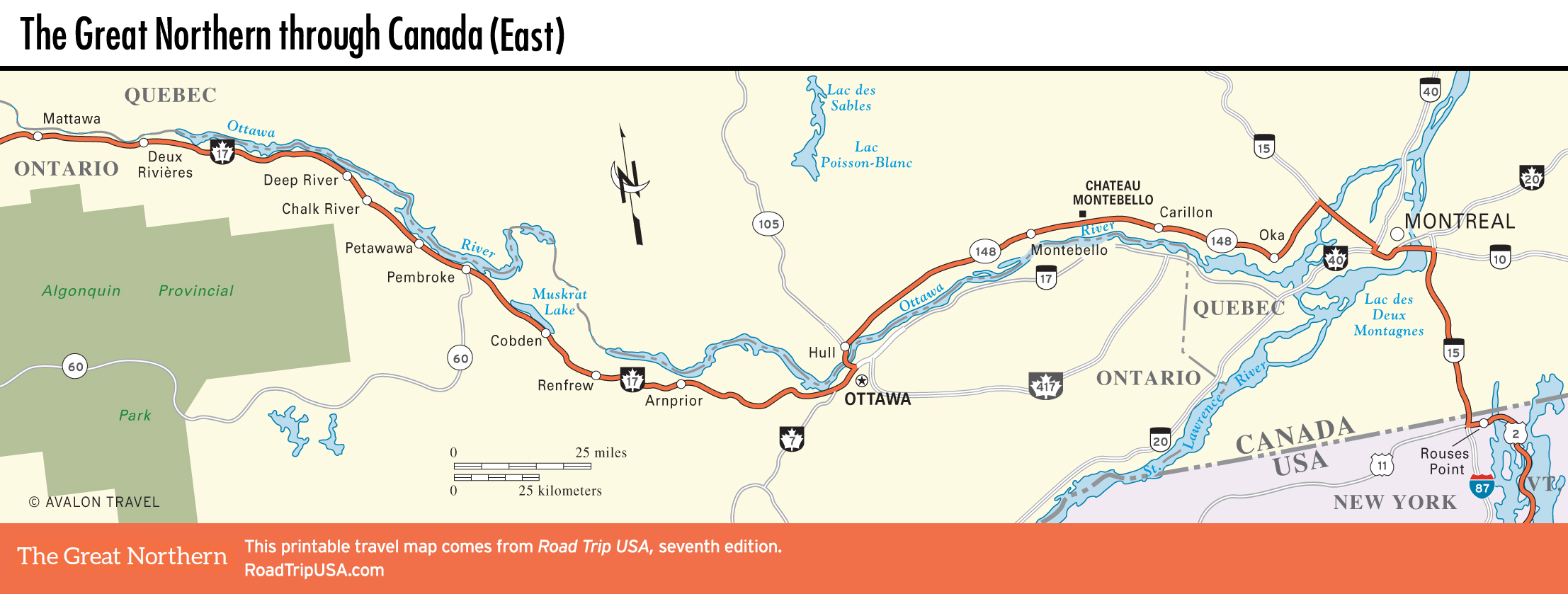Midway across the continent, the Great Plains give way to the Great Northwoods country of Minnesota—birthplace of both Paul Bunyan and Judy Garland—and then to the rugged lumber and mining country of Wisconsin and Michigan’s Upper Peninsula. Continuing due east, the route crosses the border into Ontario, Canada, running through the francophone environs of Montreal before returning to the United States near lovely Lake Champlain in upstate New York.