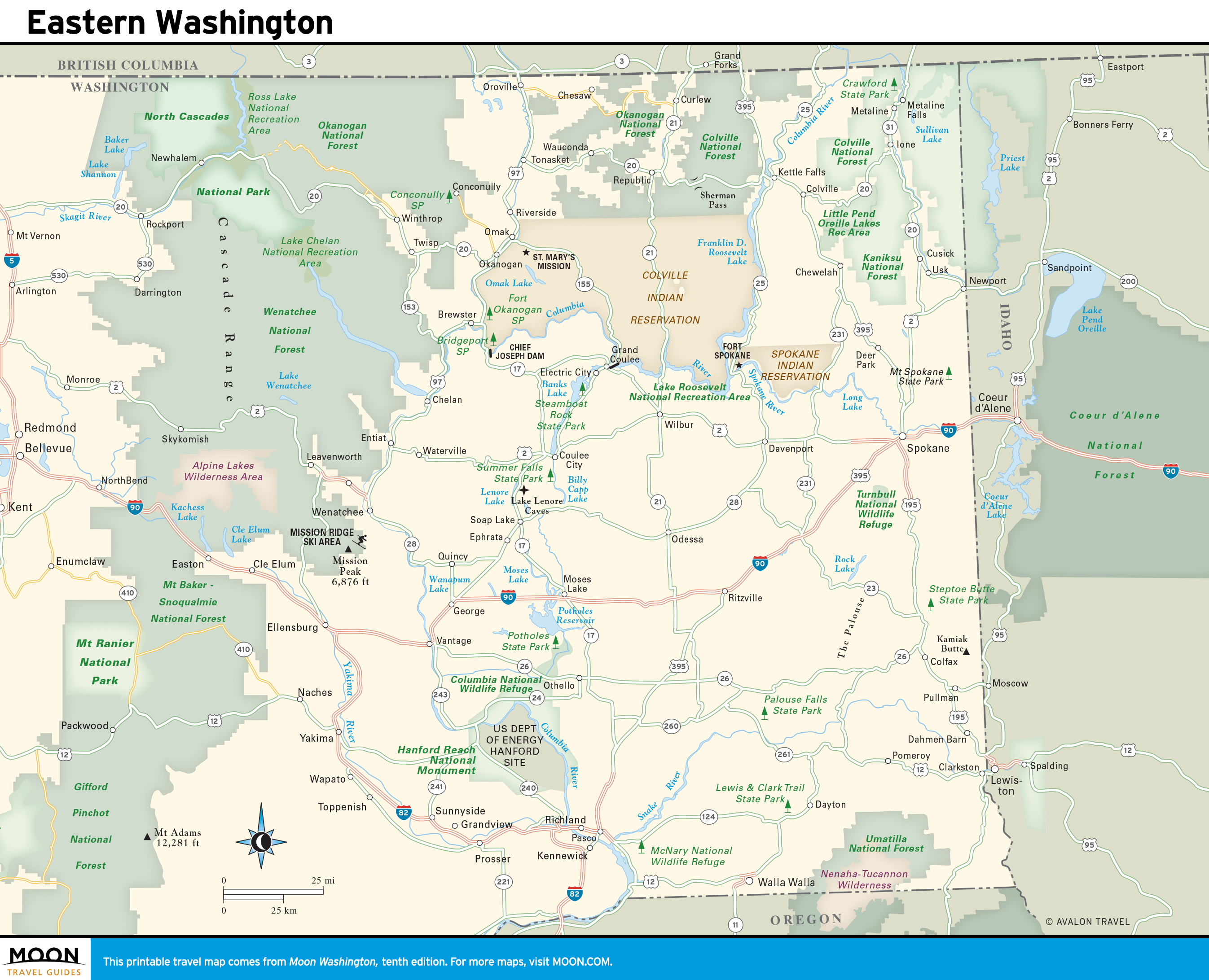East of the Cascade crest, the rugged volcanic landscape suddenly becomes drier and much sparser, the dense forests fading first into lush farmlands and orchards reclaimed from the natural desert, then continuing across increasingly barren sagebrush plains into Idaho.